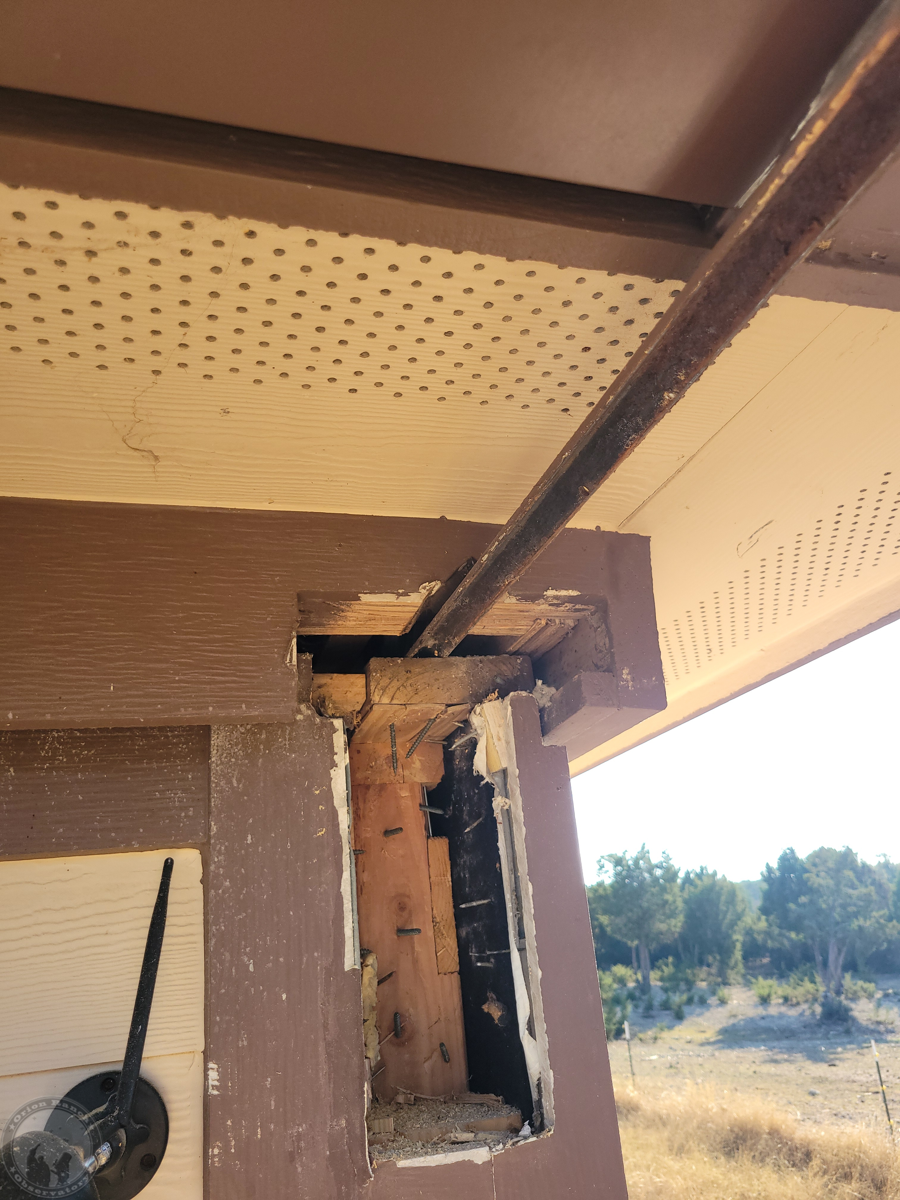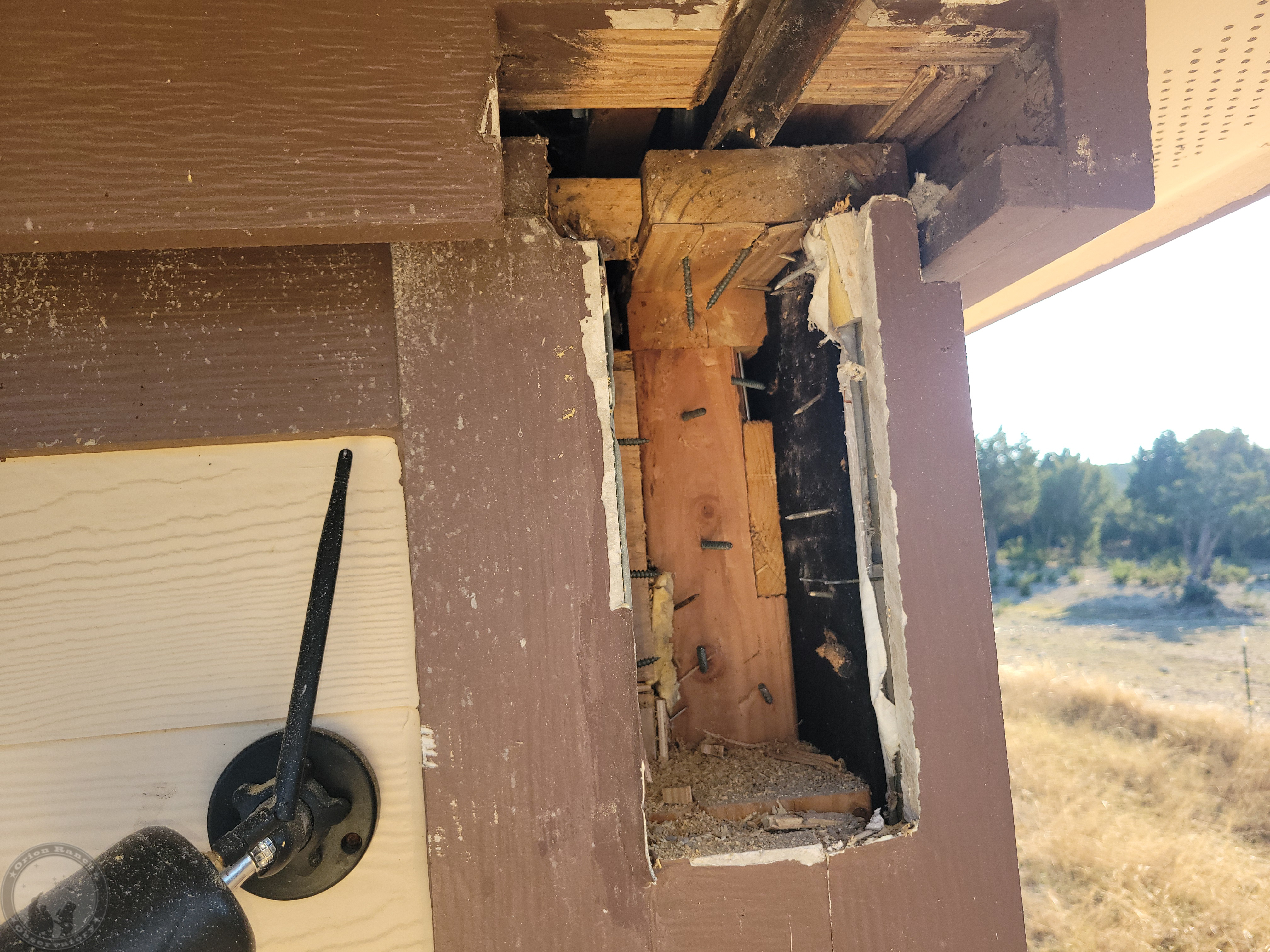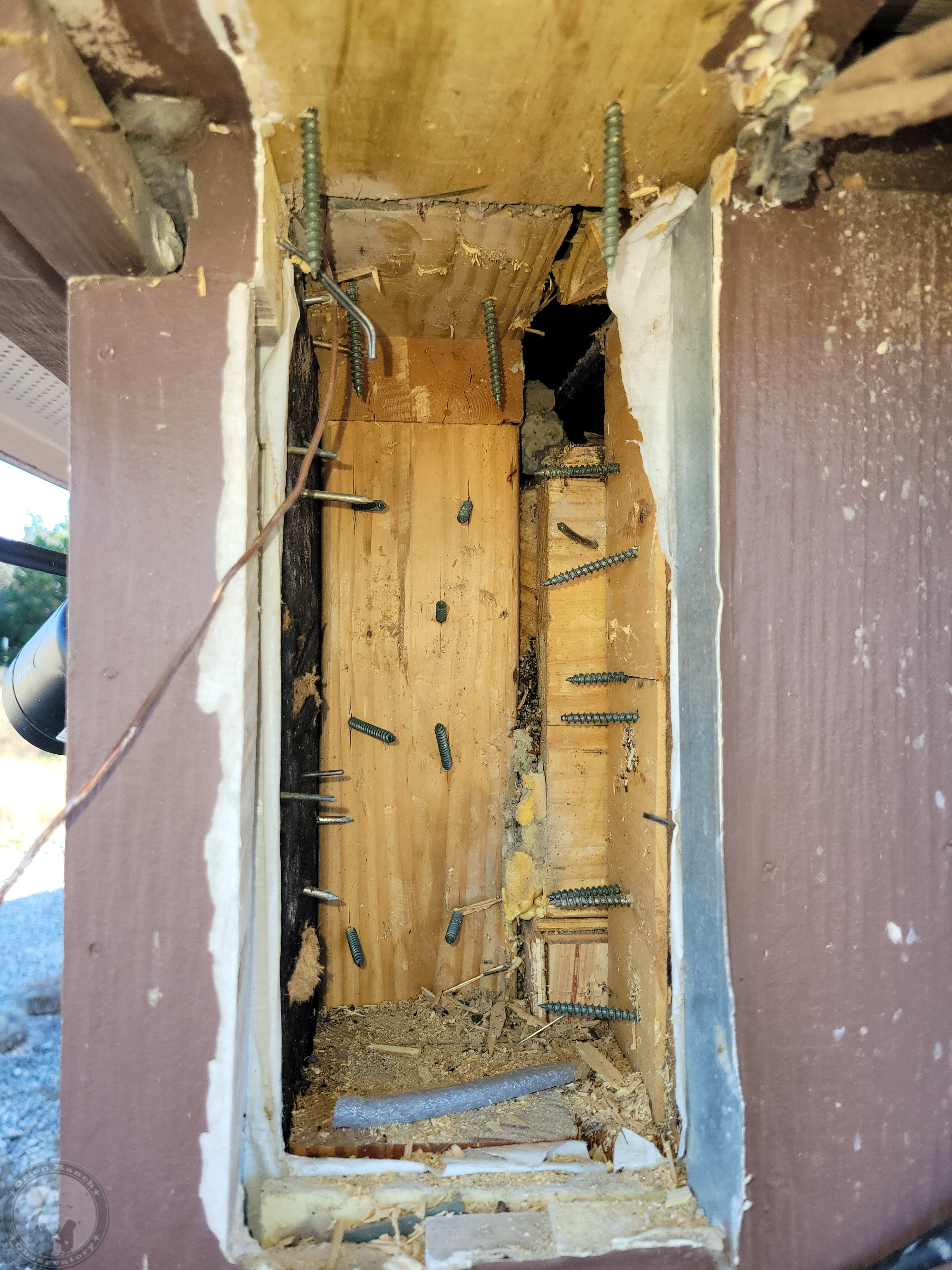 I’ll have to check the timelapse later, but this took me the better part of a day to get this rail removed without damaging everything else. First I had to remove the big cell phone booster cable I’d run through on this side. The other one with the small RG cables and ground wire will be even harder to avoid damage. Still, after dulling two spade bits beyond use and a lot of chiseling, I finally got the entire rail out. Need to decide if I’m going to keep that overlapping cap board or not. Probably not.