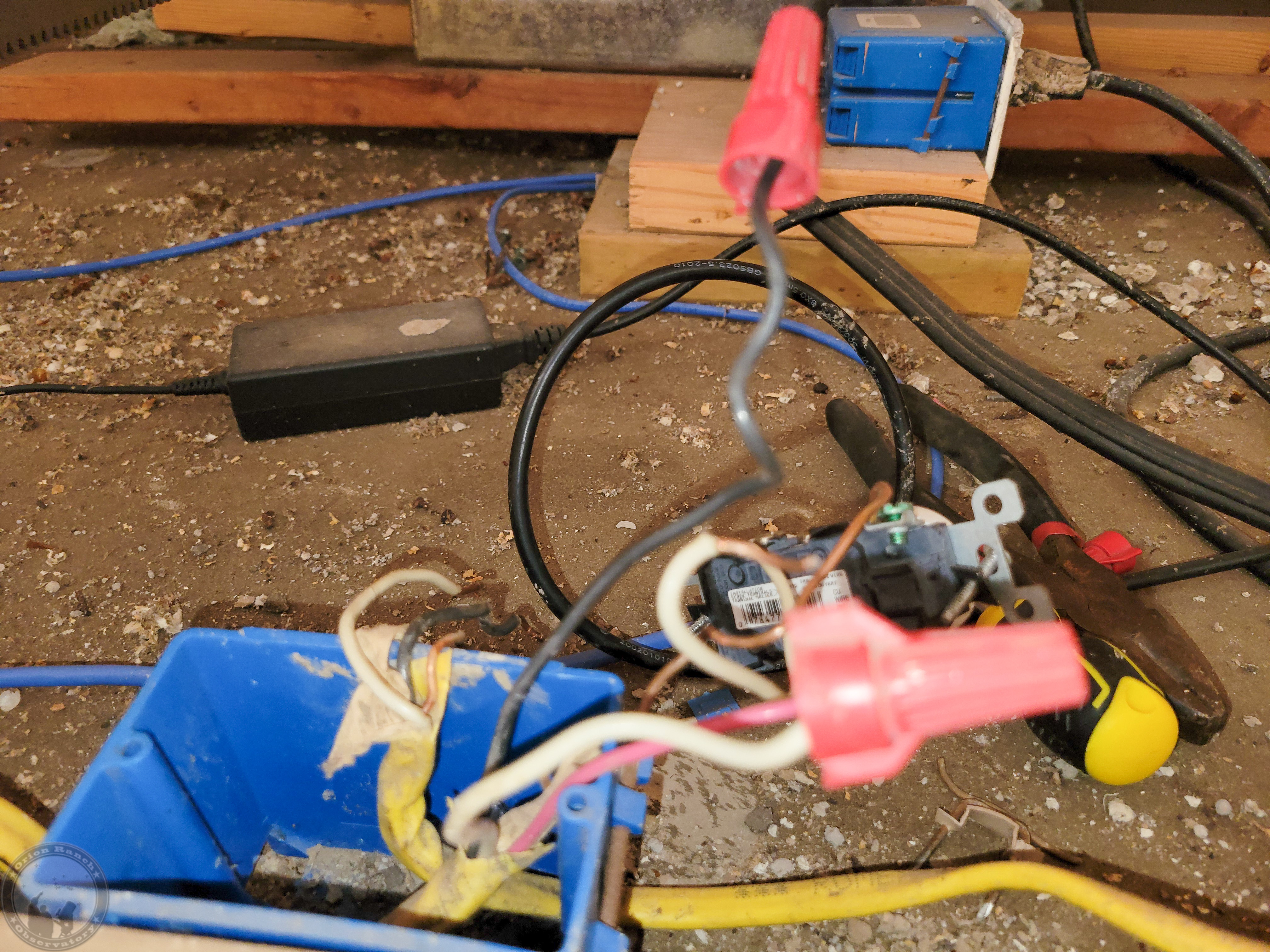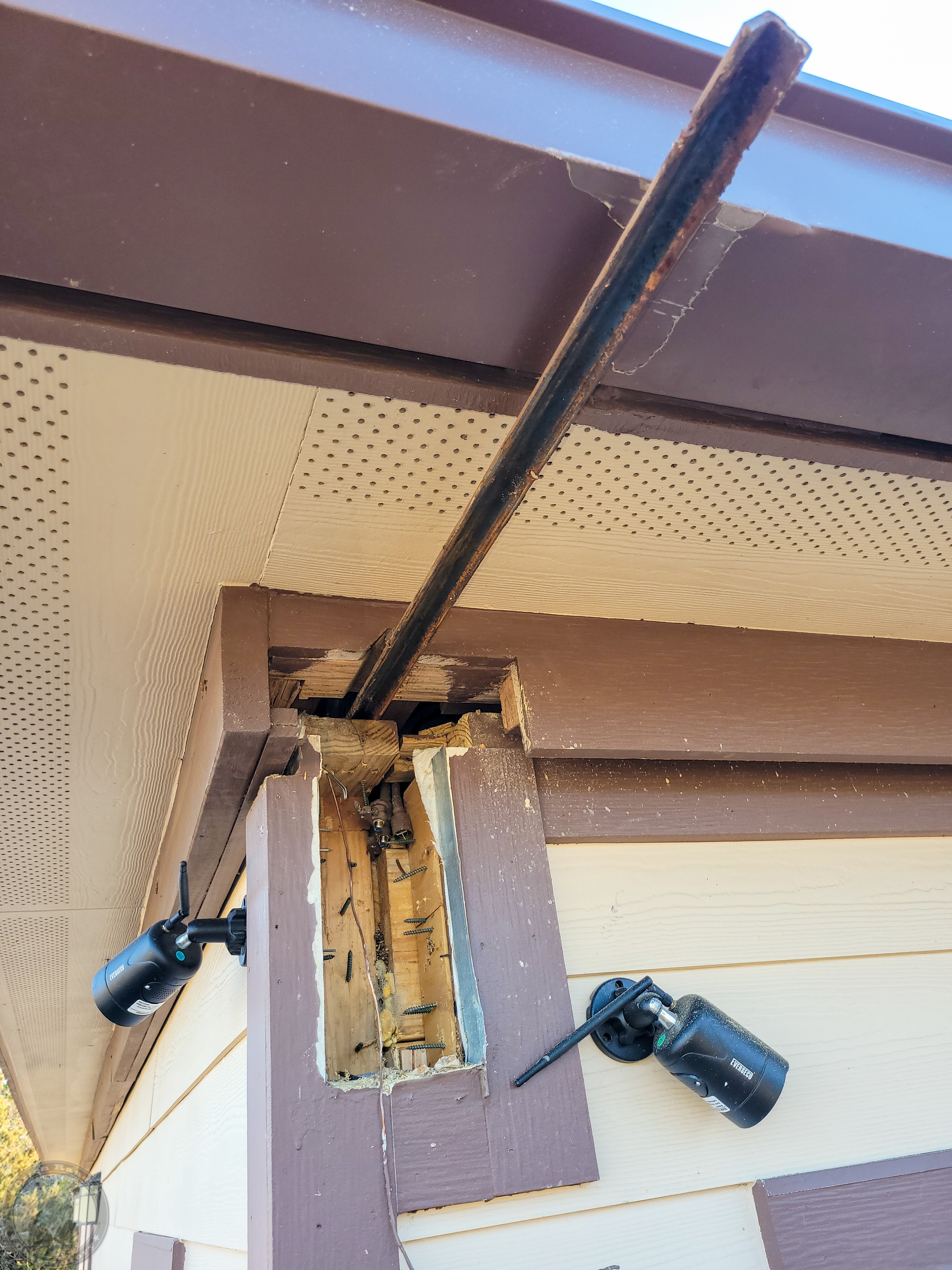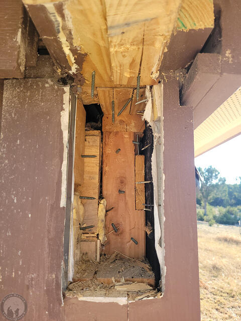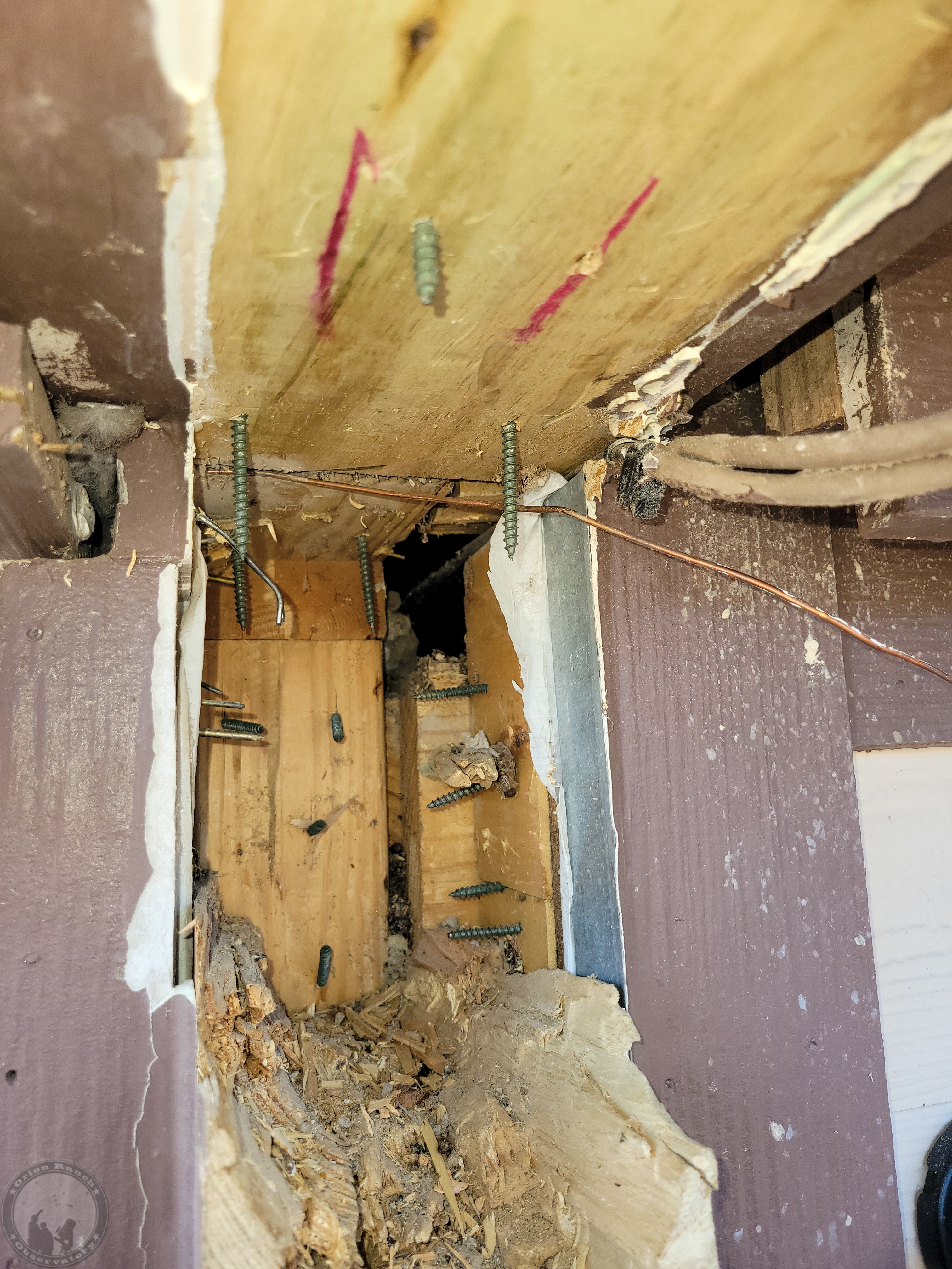 I’ll have to check the timelapse later, but this took me the better part of a day to get this rail removed without damaging everything else. First I had to remove the big cell phone booster cable I’d run through on this side. The other one with the small RG cables and ground wire will be even harder to avoid damage. Still, after dulling two spade bits beyond use and a lot of chiseling, I finally got the entire rail out. Need to decide if I’m going to keep that overlapping cap board or not. Probably not.