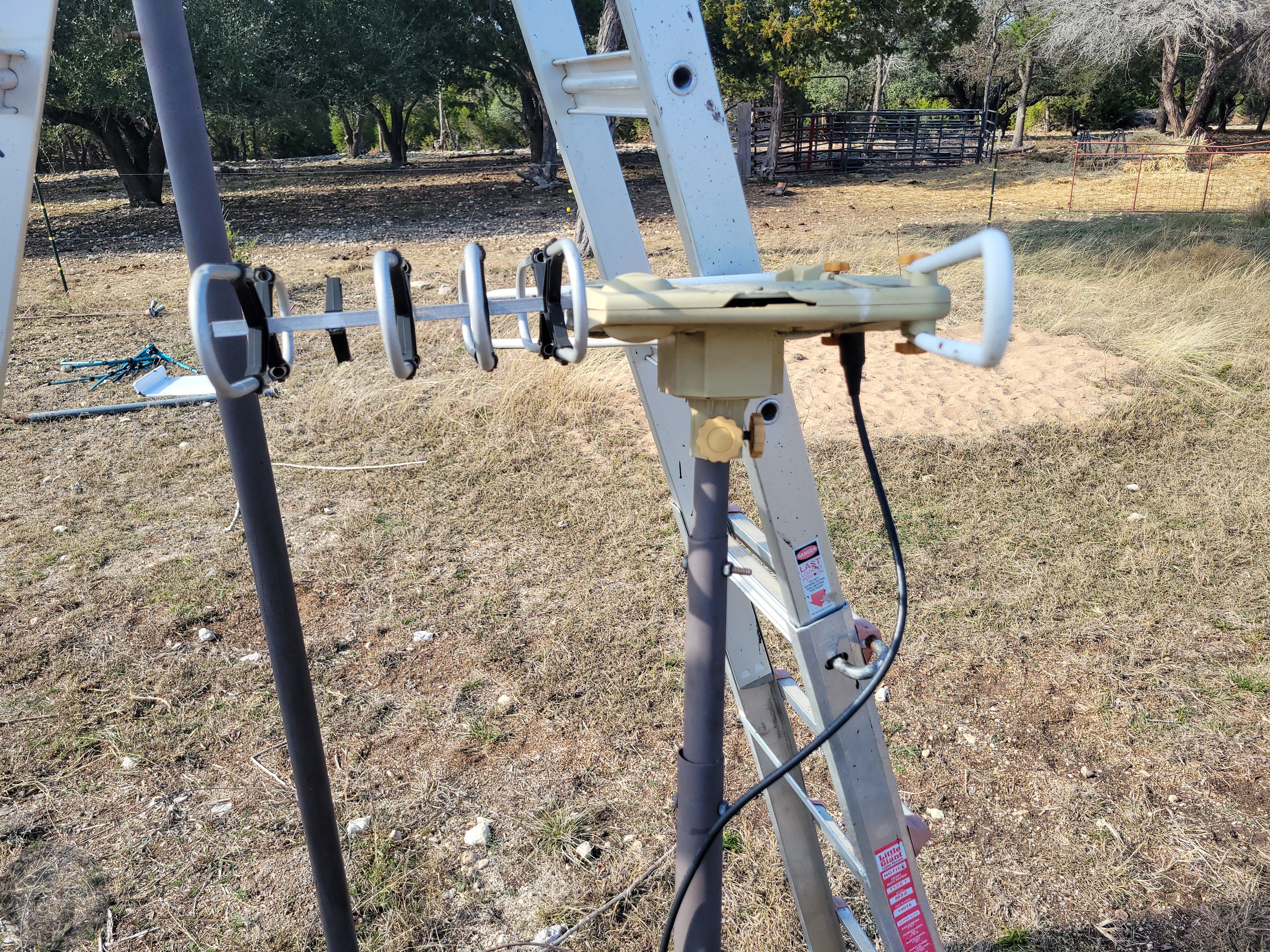 Next came pulling down the pole with all of the TV and cell phone booster antennas and removing all of the associated cables. With the hail storms, etc. they are all rather worse for wear. Not sure I’ll be putting any of this back up now that we have satellite internet, but it did make for a good lightning rod and north direction finder for my all-sky camera alignment!