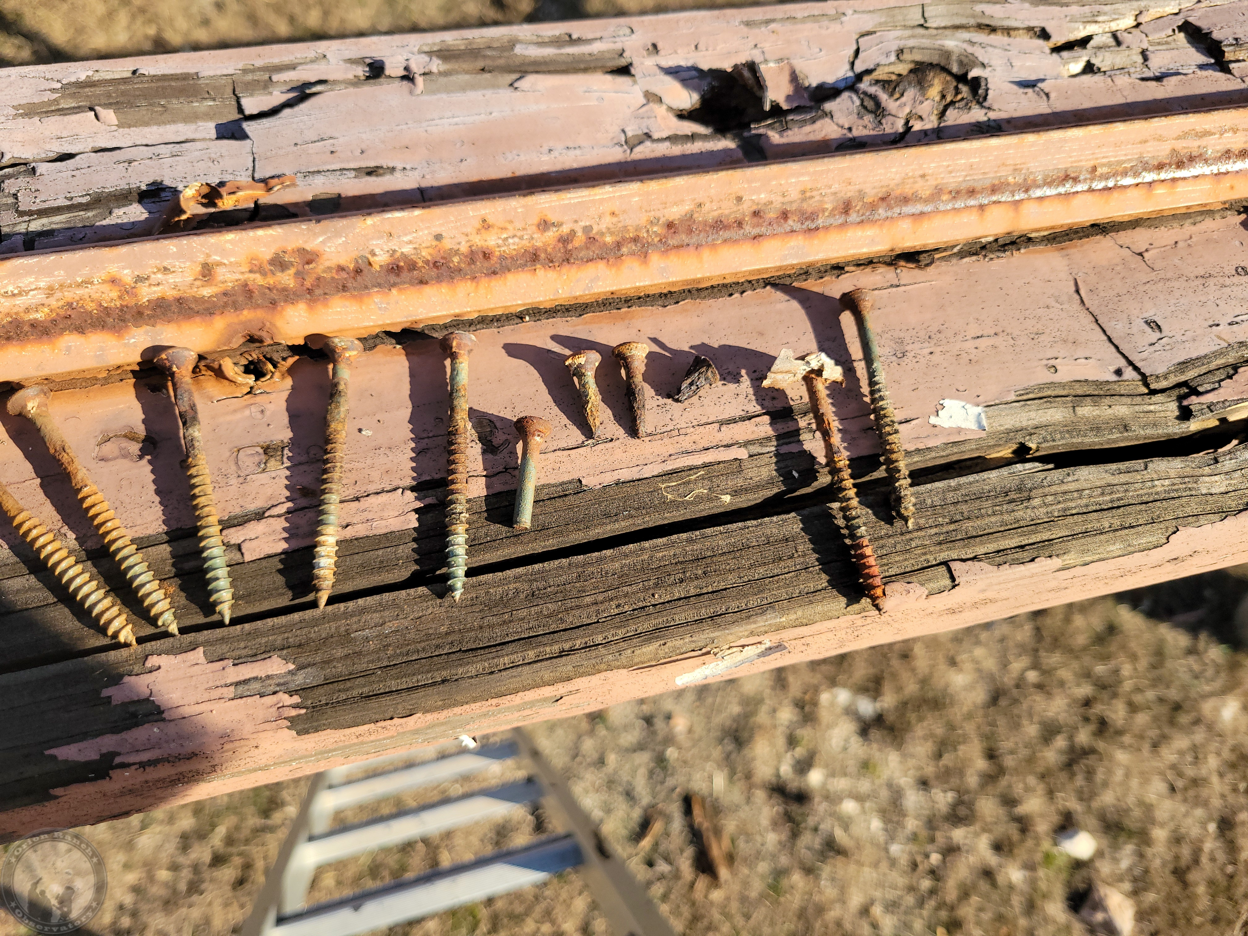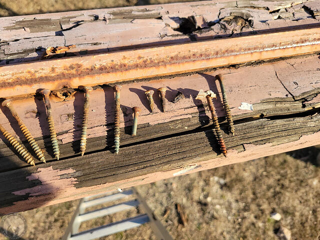 The screws holding down the angle were in various states from fine to sheared off at installation to eroded down to sharp little points. I suspect some of the latter is from the dissimilar metals in the pressure treated wood interacting with the steel in the screws where the paint was abraded at installation.