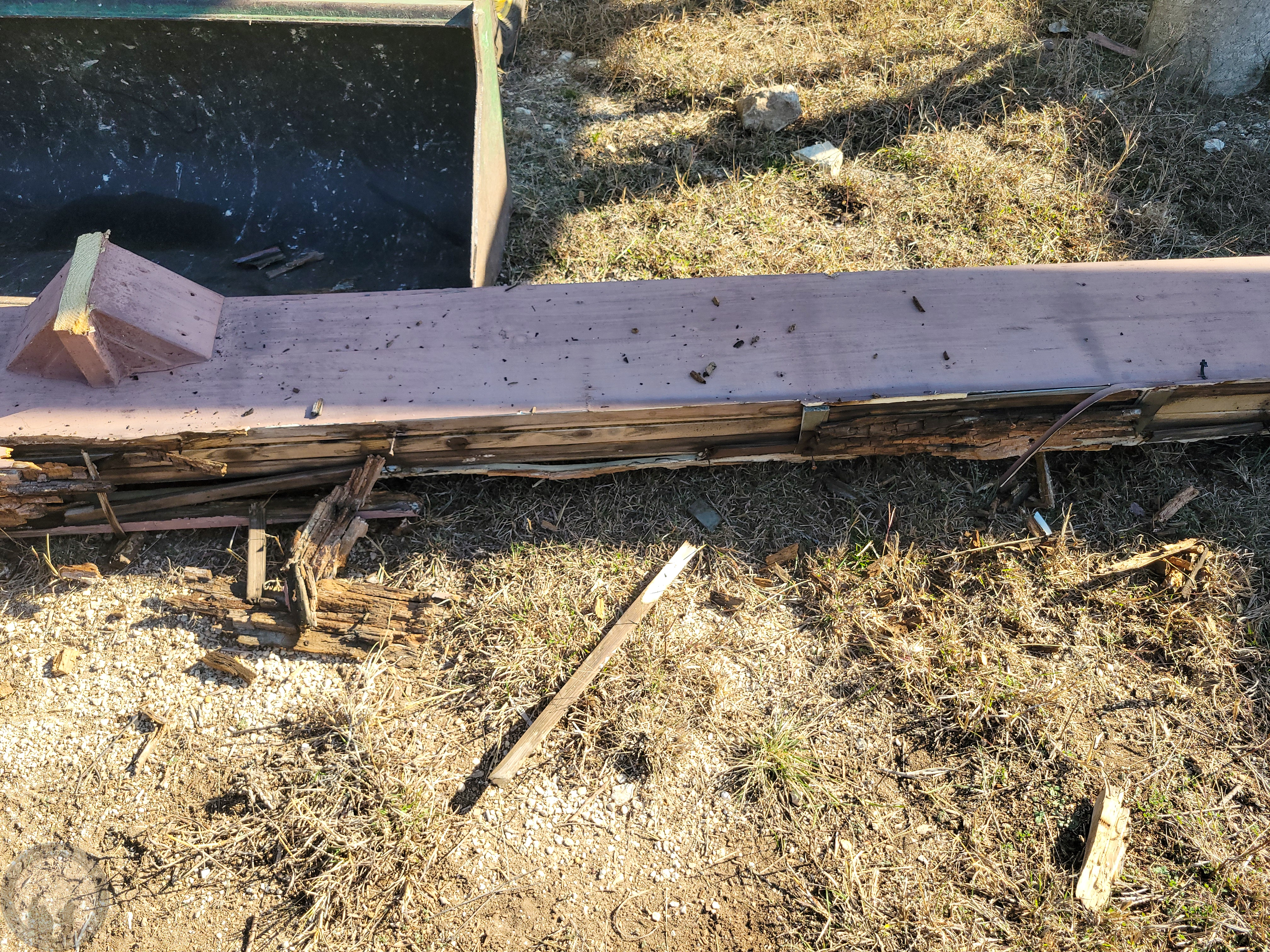 Taking down the second beam, which was the tallest and had the most rot, I ended up dropping it. Trying to pick it back up by hand to get it into the bucket, the top rail crumbled, revealing the perfect beam underneath, as well as all of the wedge spacers I’d used to get the top perfect. It was also amazing just how light the triple laminated beam was! Putting it up, I remember that I could barely lift one soggy 2×12 into place at a time! Now the entire beam probably weighs about what one 2×12 did!