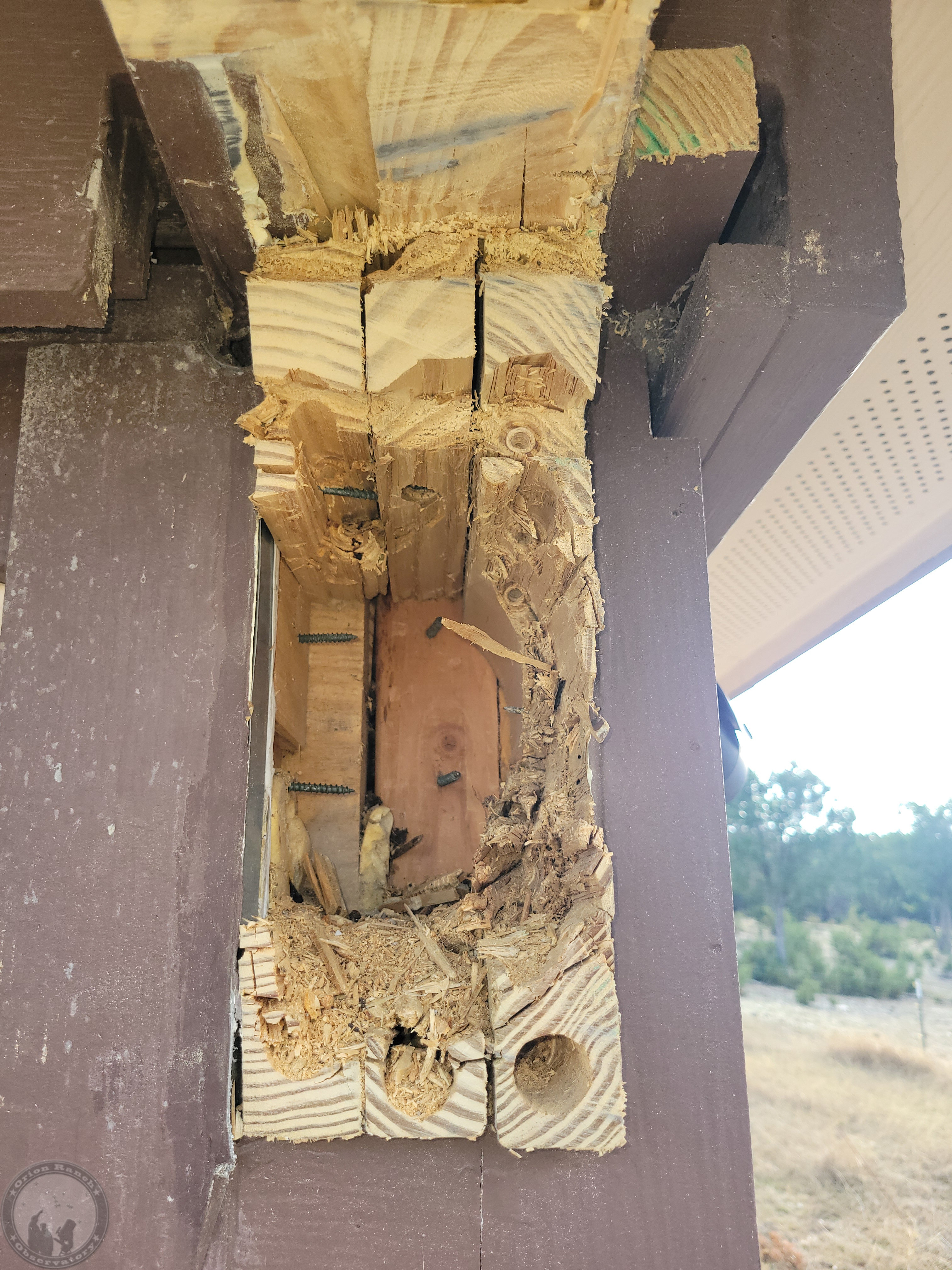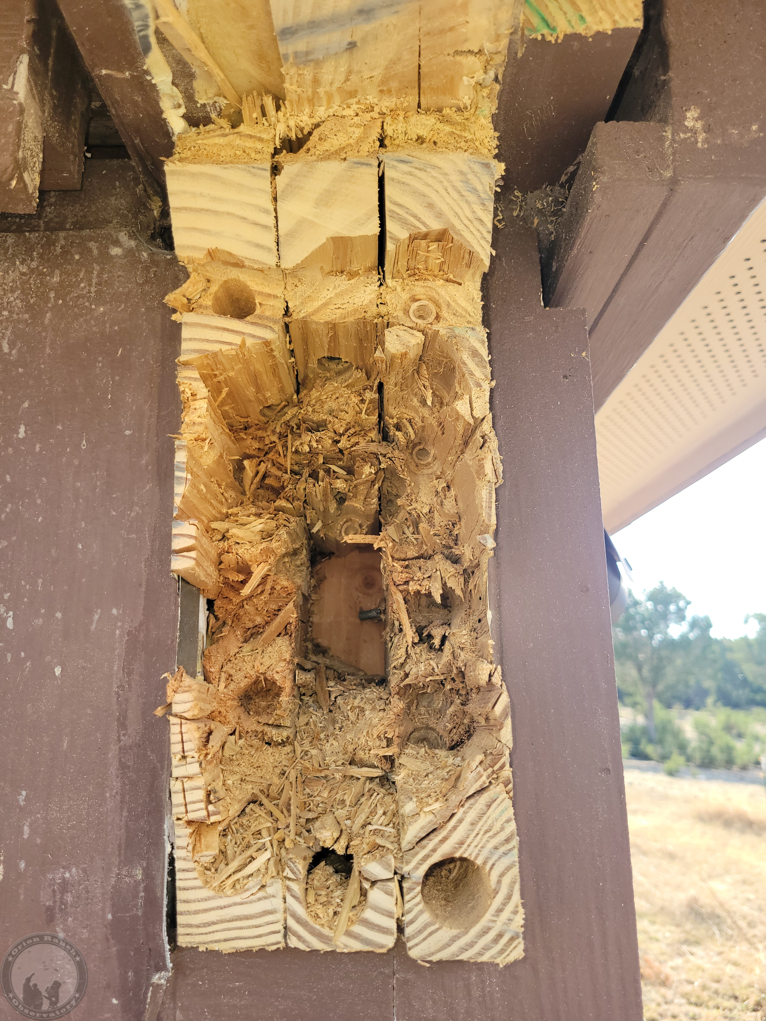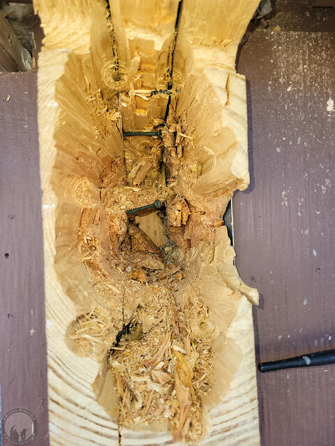 Then it was drill, chisel, drill, chisel. Here you can see a couple of the screws holding the laminated beam together (along with the large amount of construction adhesive!). So much for the first drill bit!