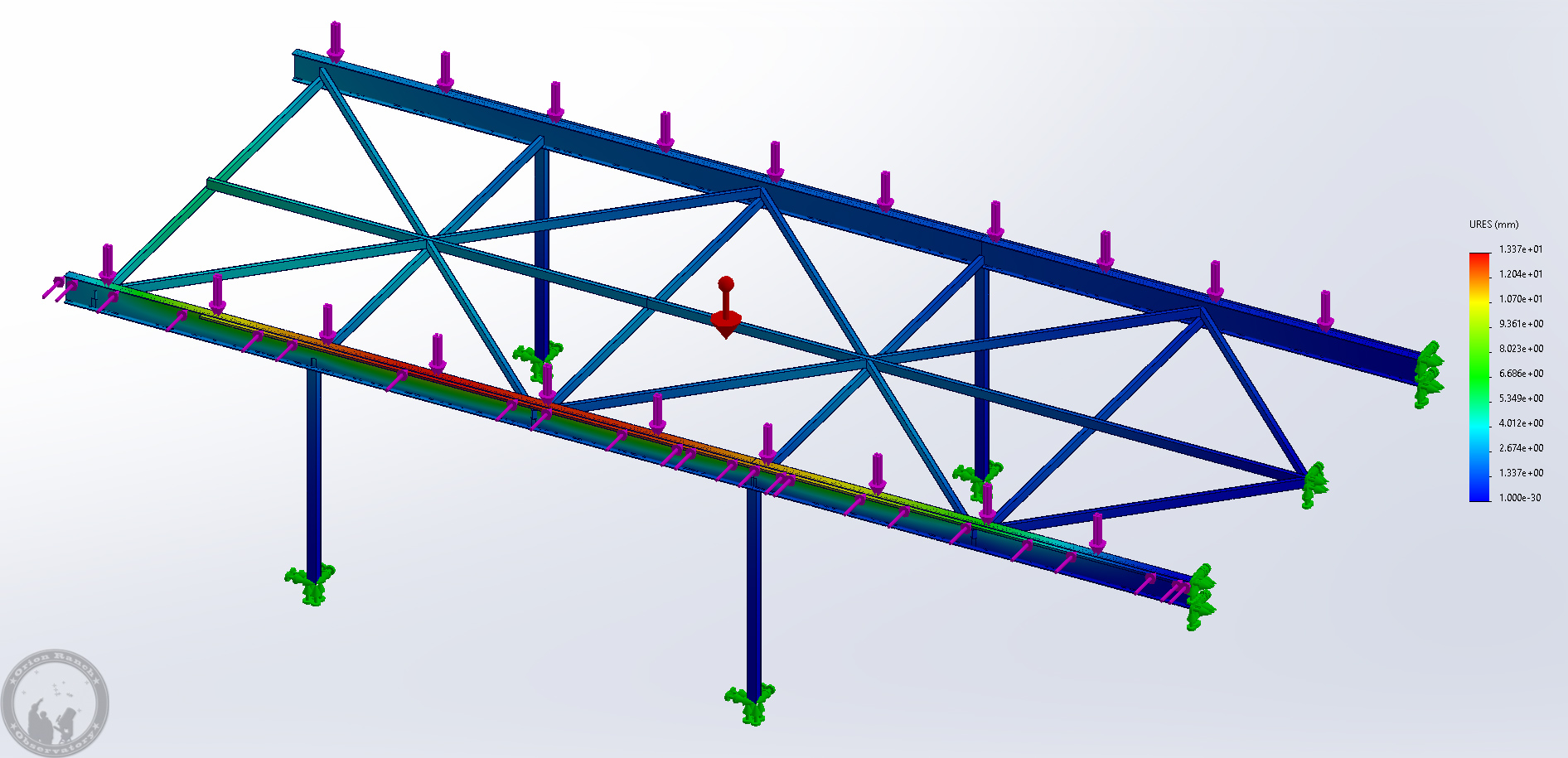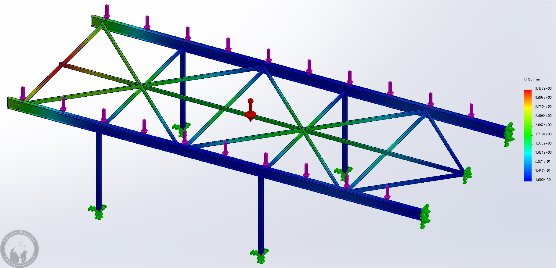 I’ve run some static load simulations to confirm how strong this will be under load. The most sag under gravity is just the bracing cross members that will sag a mm or two under their own weight. With the roof rolled completely off the observatory (observatory wall/rail repair mode) so that it’s out on the 9′ overhang I’m going to have, the H-beam will move about 1.5 mm. Normally the roof will remain over the warm room and never go out on the overhang, so it’s really just because I was going to have to pay for the metal regardless, so why not use it?!!