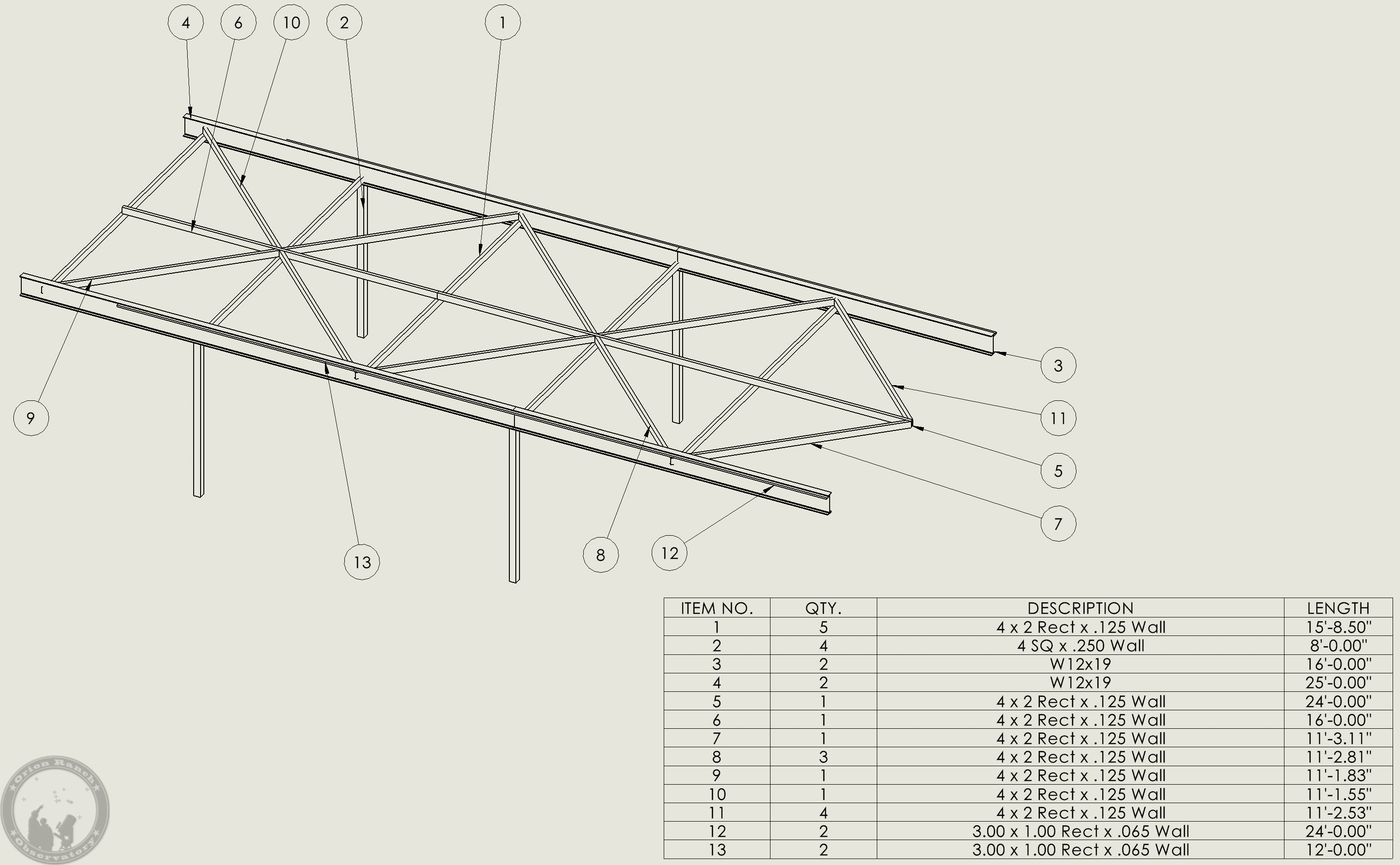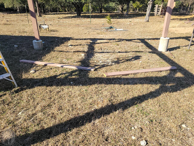 Here’s my initial plan for replacing the wood rails with steel. This will depend on whether I can get 40′ H-beams delivered and onsite vs. having to use 20′ beams. If I have to go with 20’s, then it will be 4′ shorter. I don’t really need the extra overhang, but it would be nice to have the option of moving the roof completely off if I ever needed to service the wood in the observatory itself. The bracing may be overkill, but this should minimize any chance of twisting, etc. on the beams. I haven’t decided on bracing for the posts.