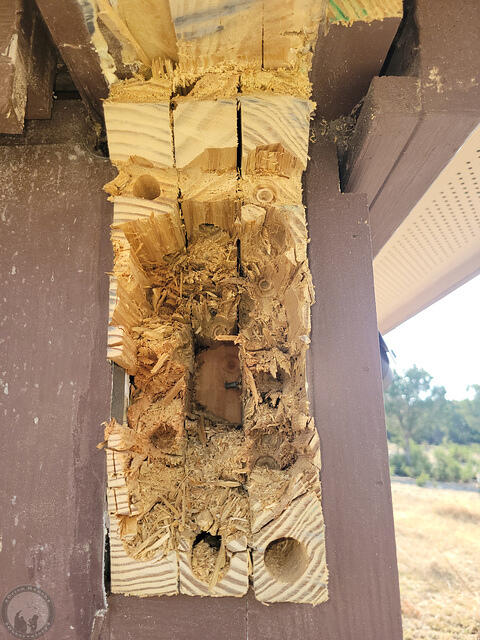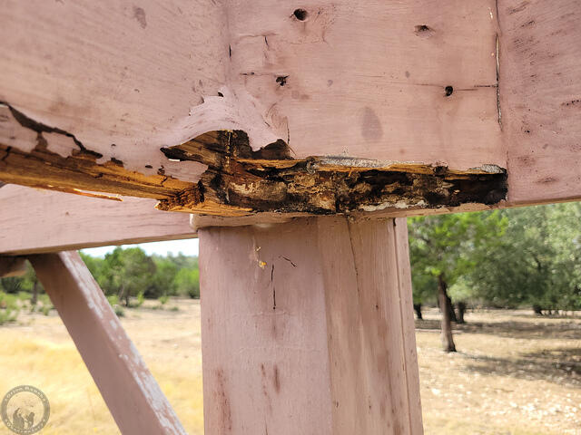 Two years ago, I’d discovered some bad rot on one of the posts and diagonal braces, so had braced all of that and reinforced it, but a hammer tap test around the rest of the rail system didn’t show any soft spots.