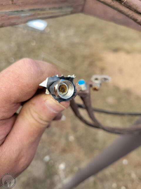Speaking of lightning, the center pin of the TV antenna cable was burnt off at the grounding terminal. I would expect lightning to primarily be carried on the shield, so it’s more likely it was the DC power supply that ran the amplifier in the antenna when all of that probably got shorted out with the busted housing and rain.