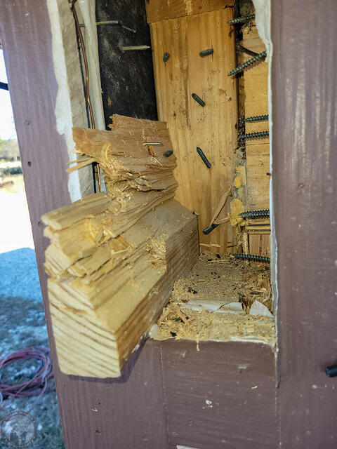 Once I got down to the back of the beam at one point, it started going a bit easier, although that outer/right 2×12 was EXTREMELY tough! Hard to make much progress on it with the chisel.