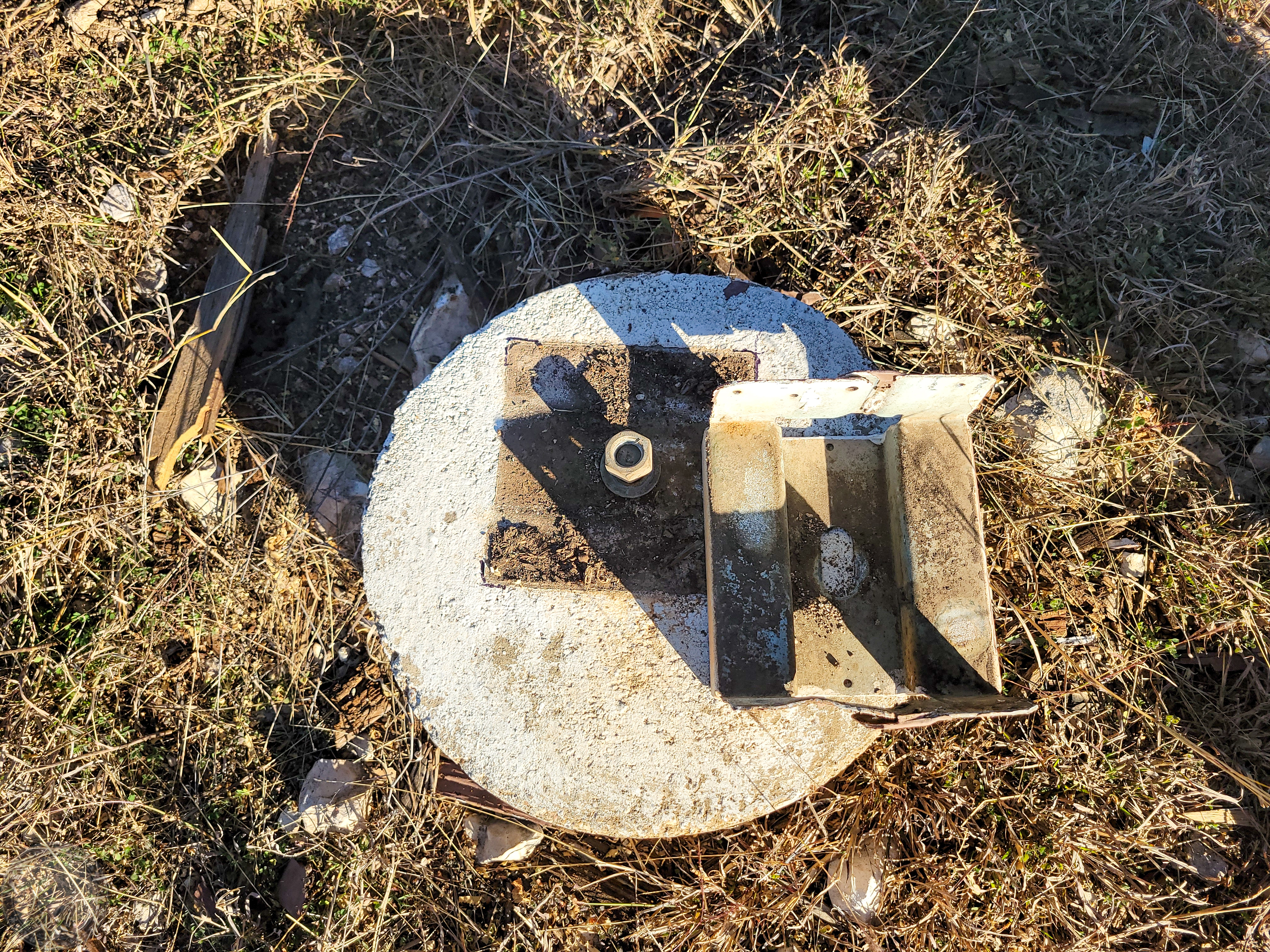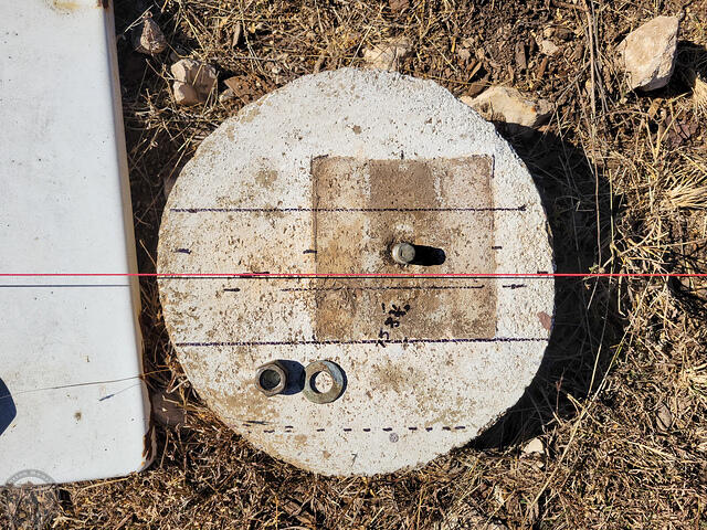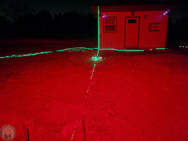 I made a bit more progress, although never as much as I hope! I started by getting out my self-leveling three-beam laser and attempting to transfer the centerline of the angle iron to the ground. Tough to do with the Sun up, but still not everything I need to ensure things are perfectly aligned.
