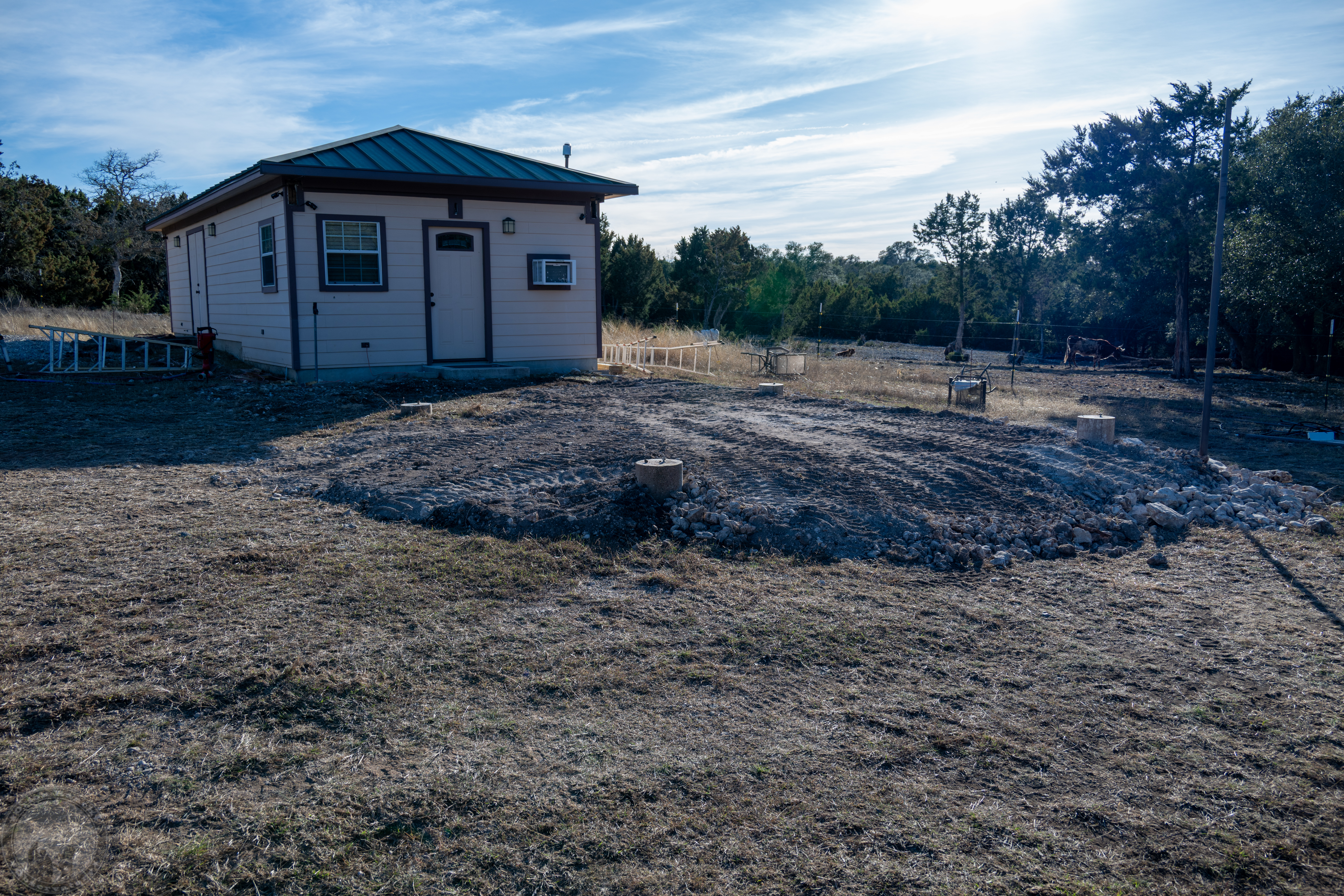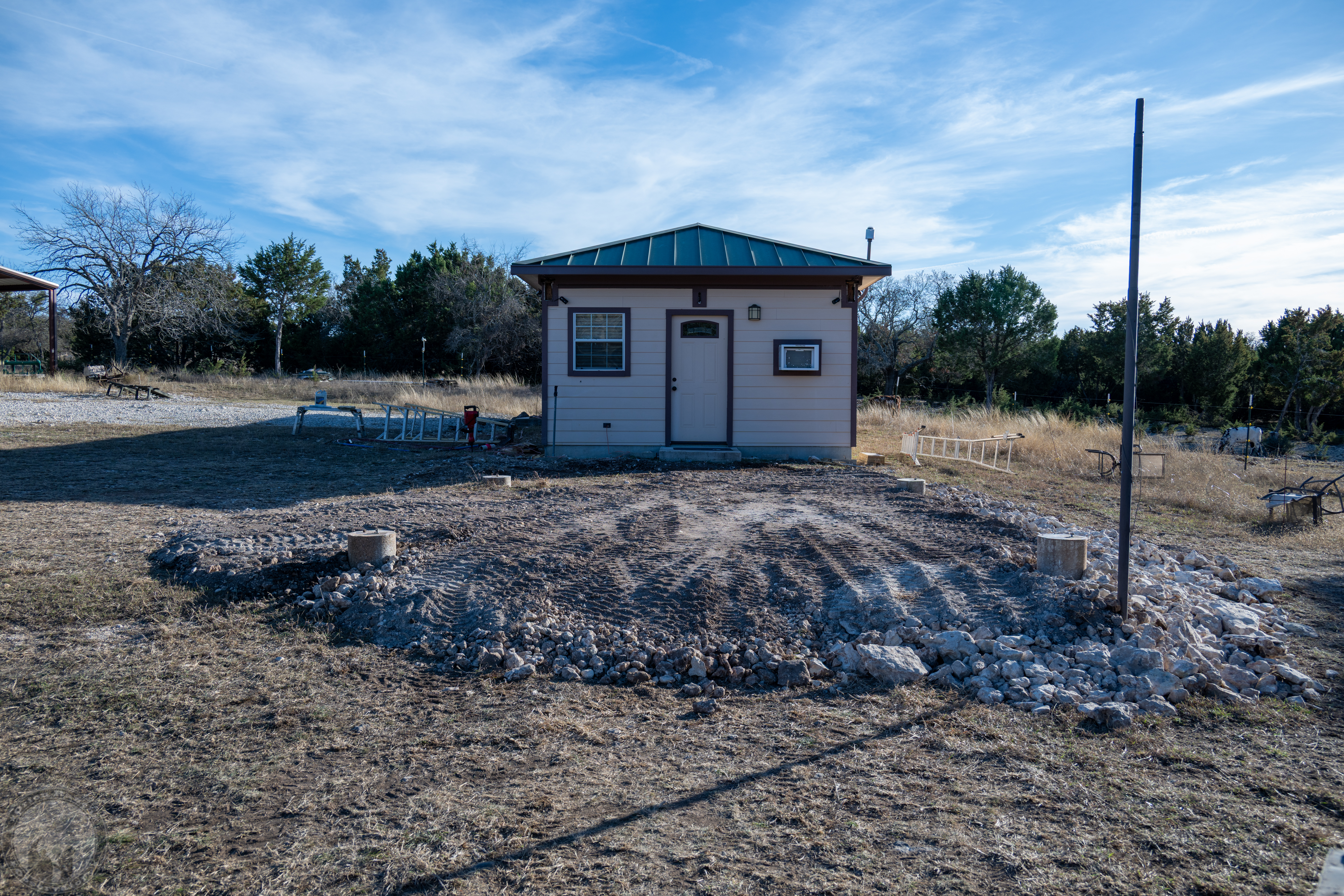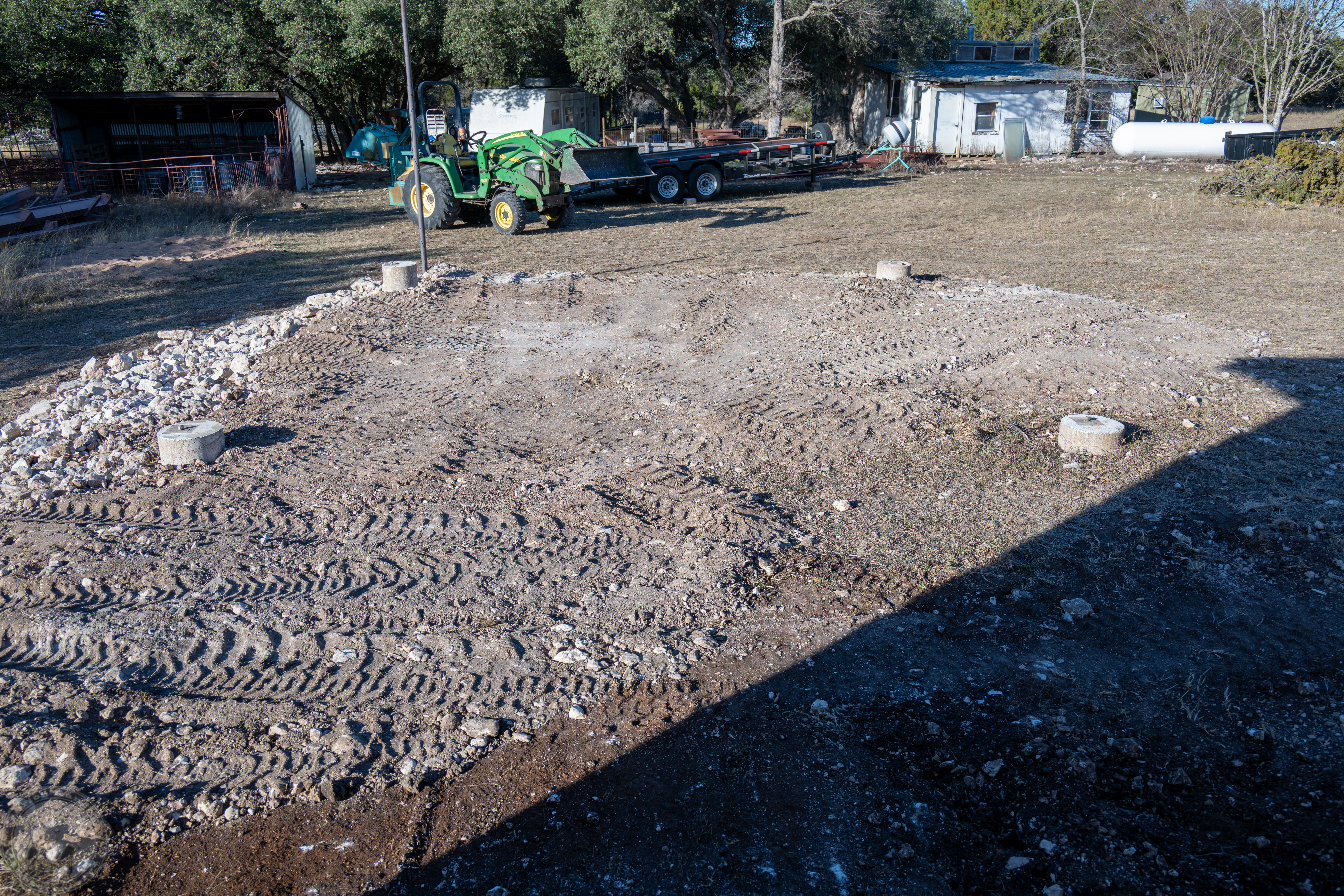 I didn’t get to putting up any steel yesterday, but I did get a nicely leveled pad in place. Still a bit more to do to it, but this will probably do for now.