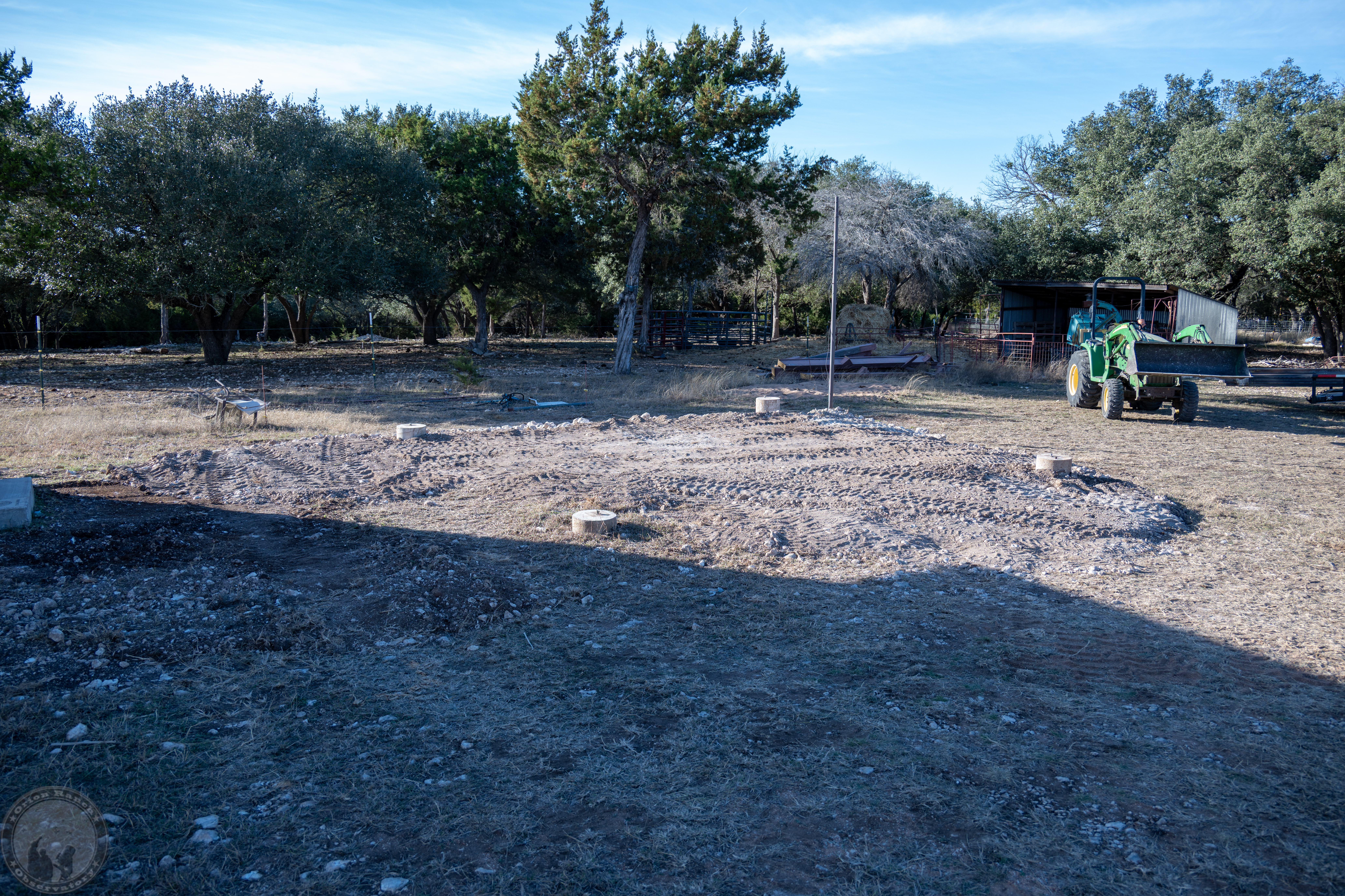 I decided to go ahead and do something I didn’t do previously, which is to level a pad under the rail system. That should make it easier to install each rail using the bucket on the tractor by getting it closer to level. Taking the rails down with the crooked bucket was problematic.