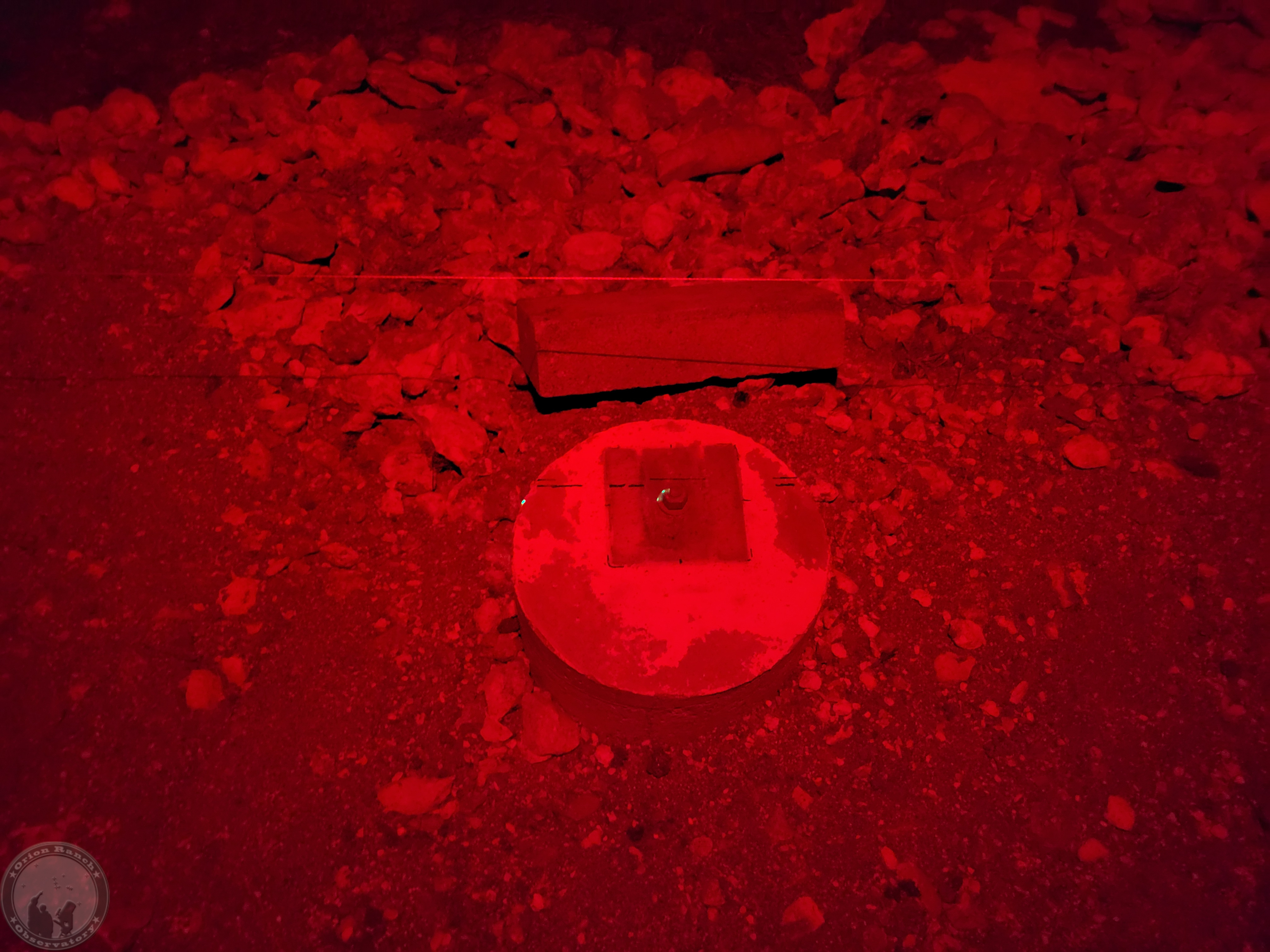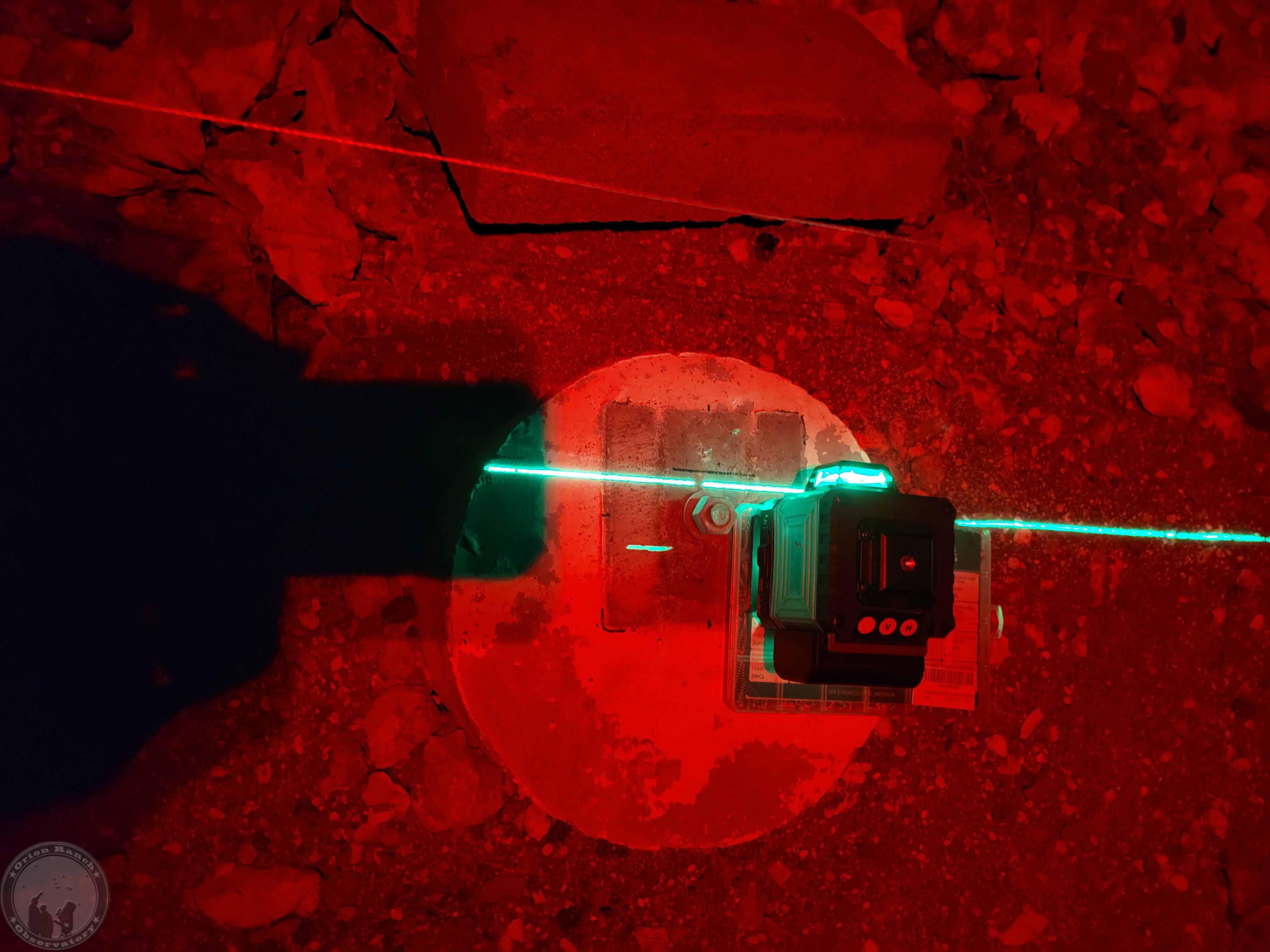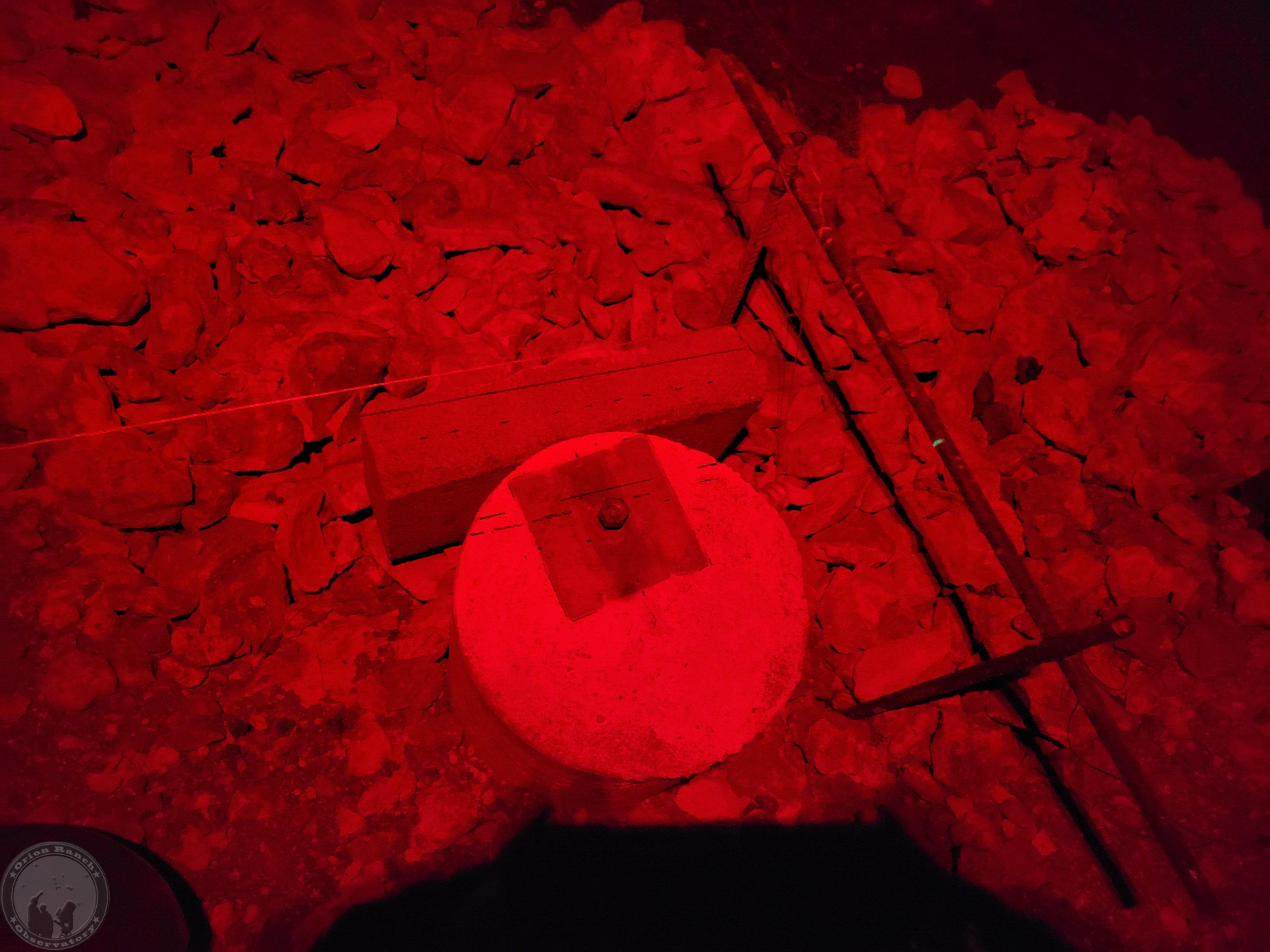 Translating that inward by the distance marked on the observatory slab using the laser gives me a 189 inch separation. The actual rail separation is 188.5″, so that’s not perfect, but close. I’m going to try the laser level again after dark to see if it’s one side or the other or just split the difference. A quarter inch isn’t going to make much difference one way or another.