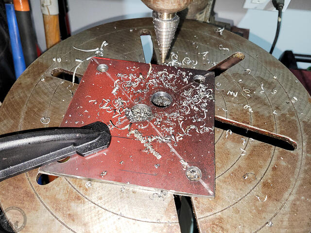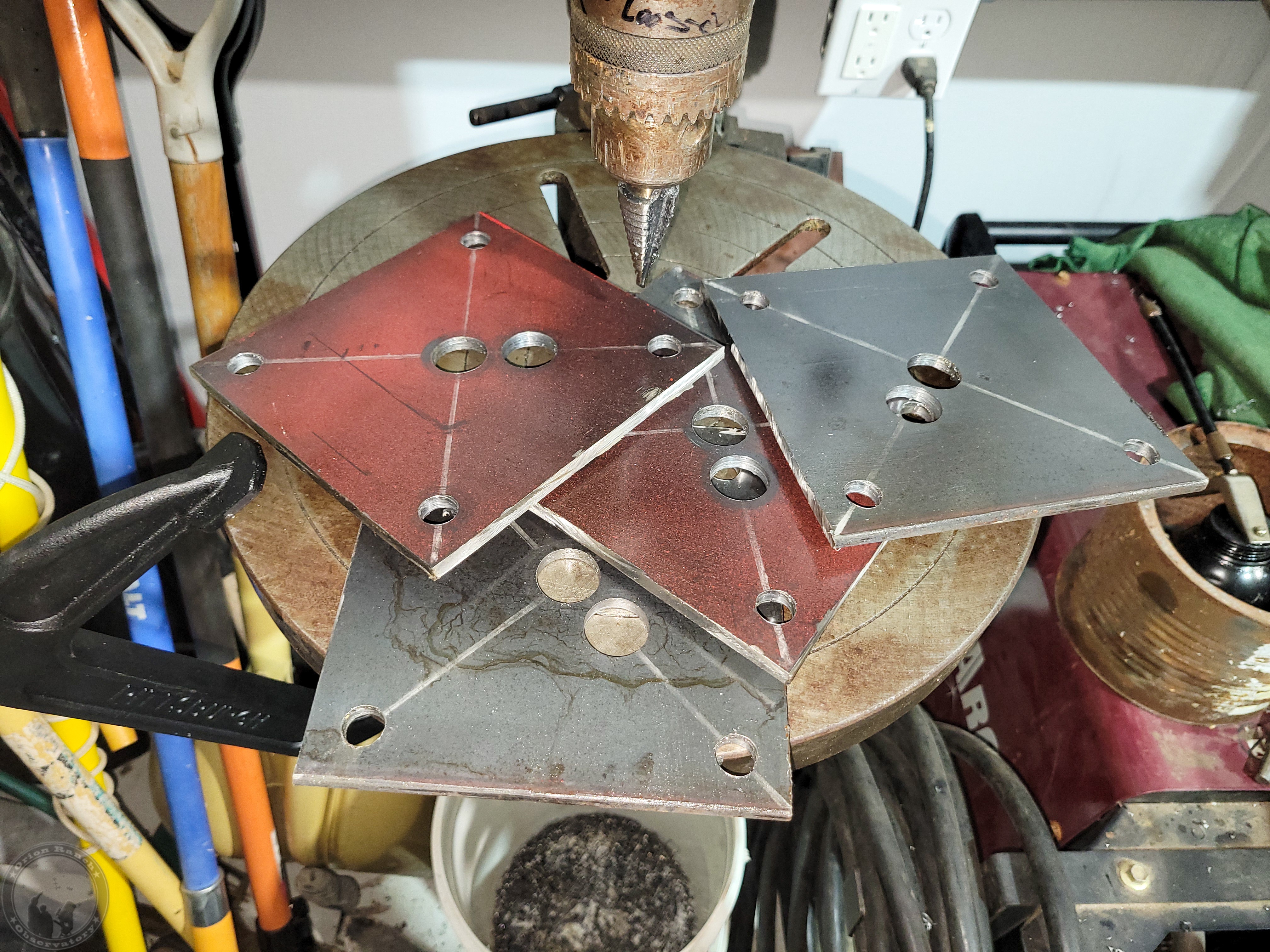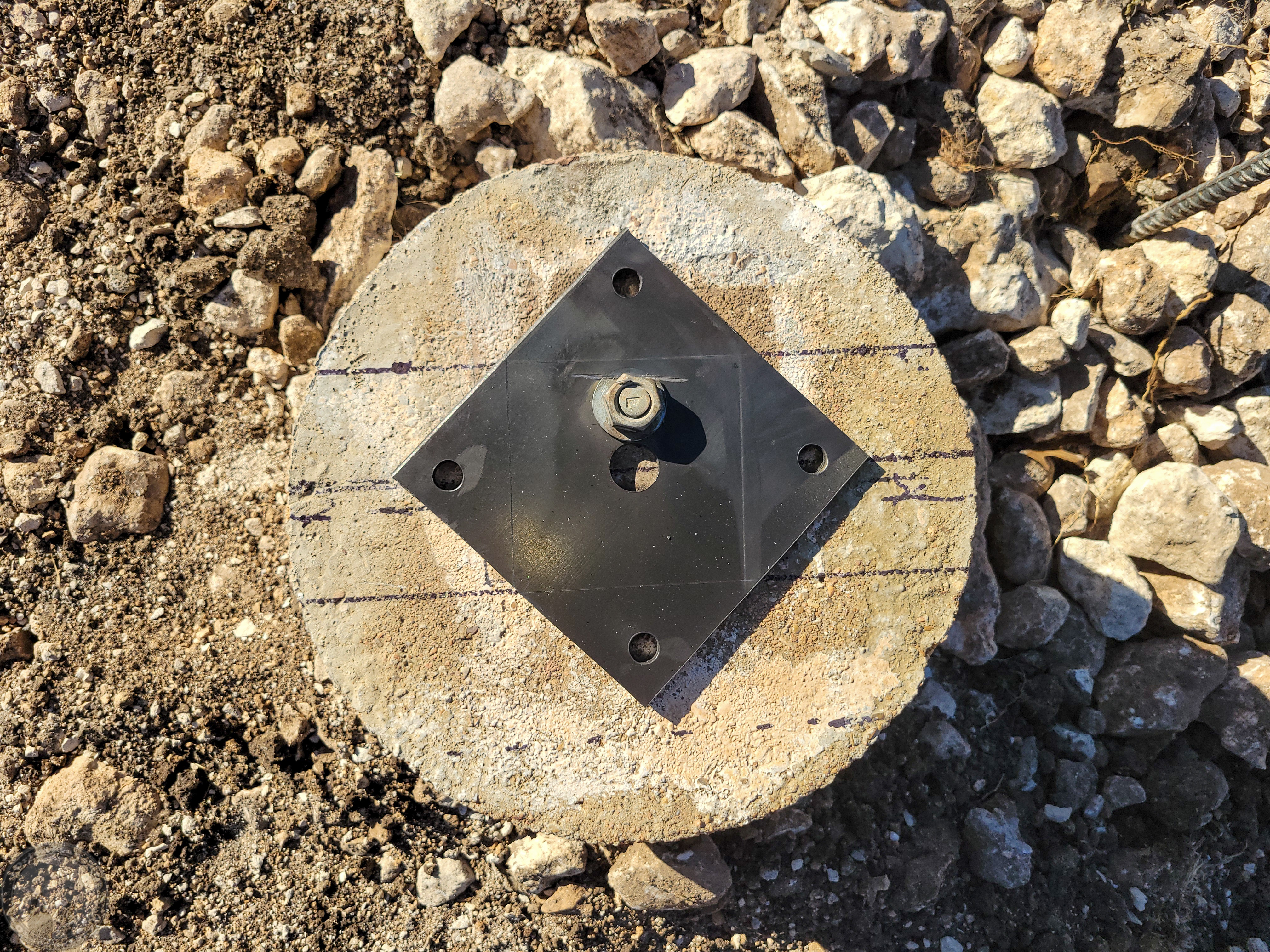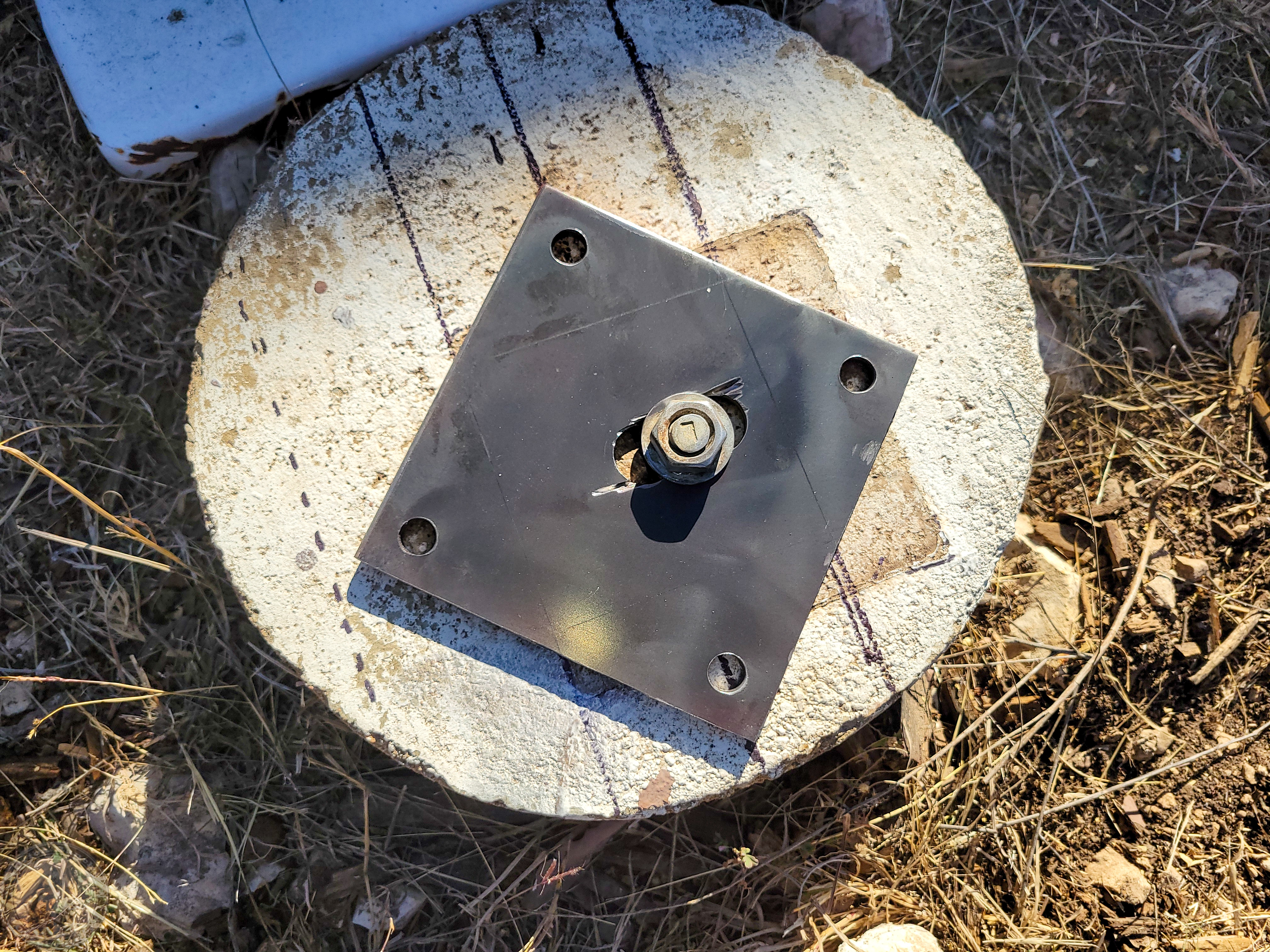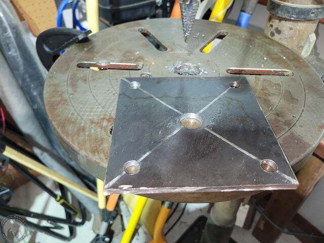 I then proceeded to cut off a 6″ strip from the 2′ x 4′ x 1/4″ plate that I bought that’s on the trailer under the beams so that I can’t actually pull it out completely! I then sliced that into four ~ 6×6″ squares and drilled a large center hole and four corner holes. I was going to do 8×8″ base plates, but those would end up hanging off the round piers on the West side where they weren’t poured in the right place (I’d aligned them off the slab, which turned out to be crooked!) Instead, I plan to rotate the base 45 degrees so that there are triangular tabs on each side giving me more room to install additional anchor bolts after the post is in place. Since I plan to add the corner anchor bolts after everything is in place, the center stud will be the only thing holding the plate and post initially. I’m debating whether or not I’ll actually put the nut on the center stud or not. I don’t expect to ever need to remove the steel, and anyone taking it down would be chopping up steel anyway, so who cares if they have to cut the post bottoms too?!! I just want to be sure I can shift the base a bit in the oversized center hole if needed.