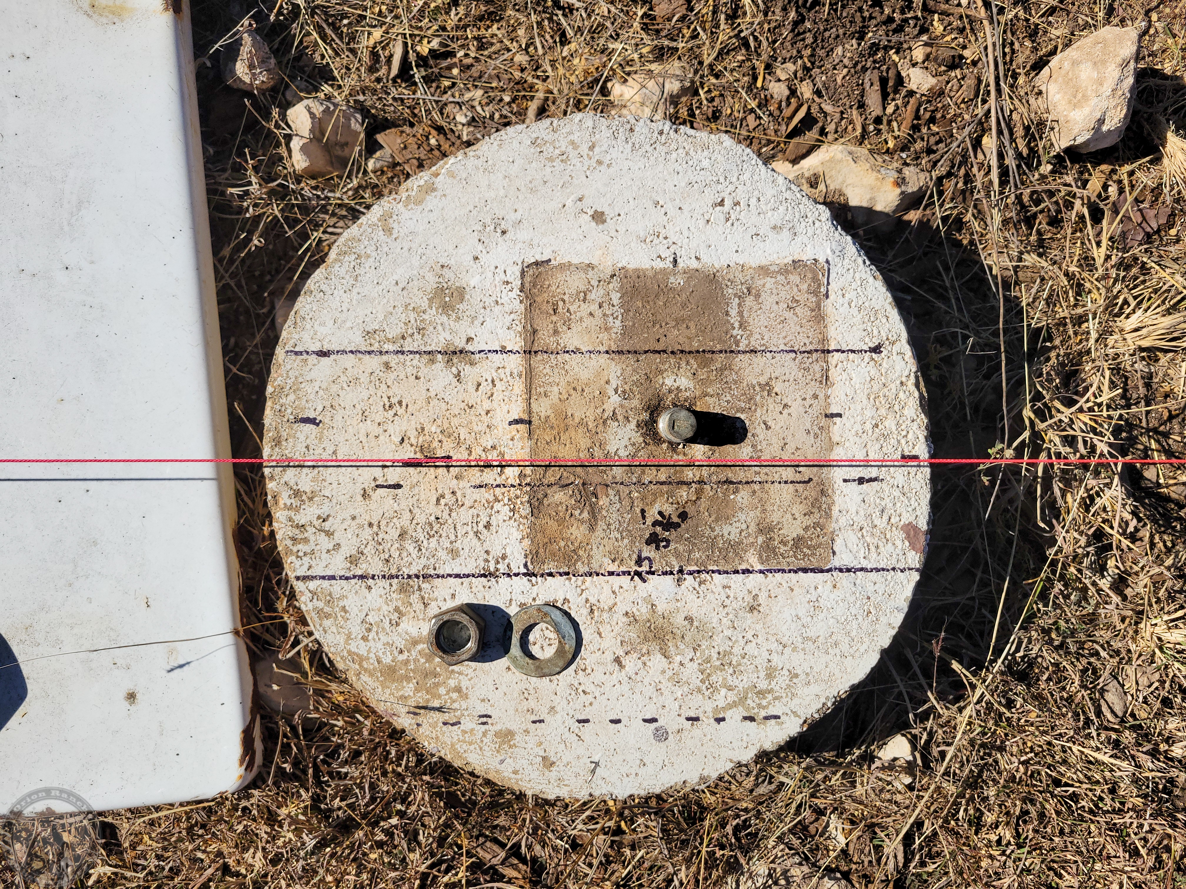 I moved the strings over to map out the centerline for each beam and adjust the spacing as needed. I then drew the 4″ wide lines for the post location. These pictures were taken around the time or just after the Sun was at Zenith, so the shadow of the string was right on my line!