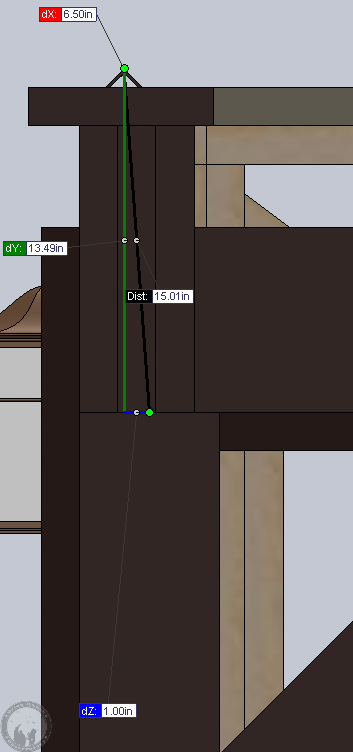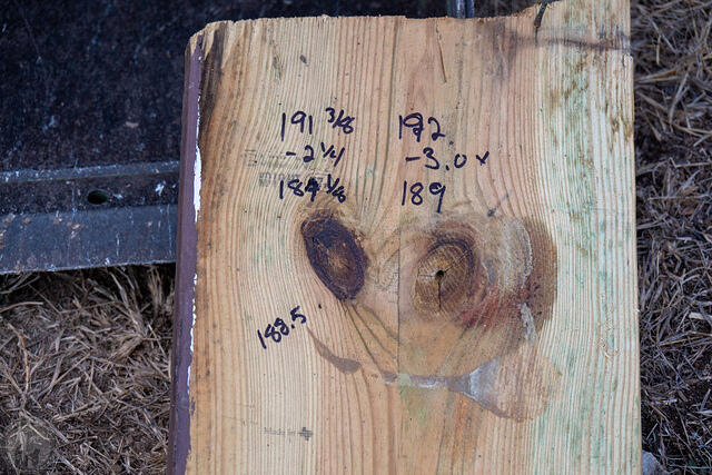 Going back and reminding myself of the original rail design, the angles are centered on the 2×4 walls, so (16′ = 192″) – 3.5″ = 188.5″, while the old posts for the rails were 6×6’s, so 192″ – 5.5″ = 186.5″. Thus, to center the new posts, under the angle, I need to move them out 1″ each side. The old posts weren’t centered under the rail, they were aligned to the outside.