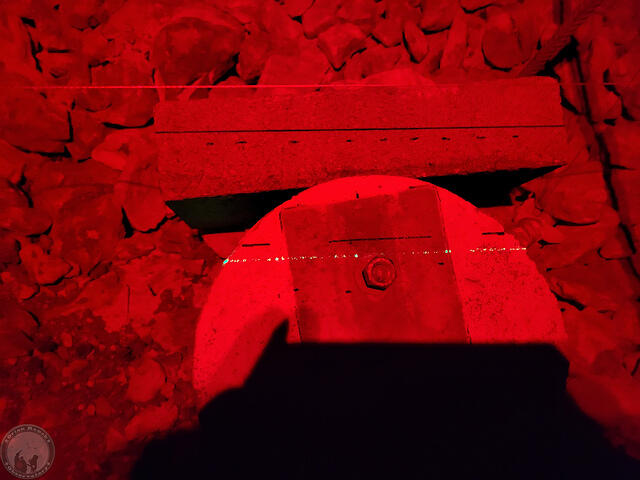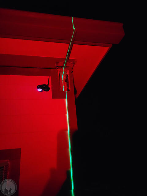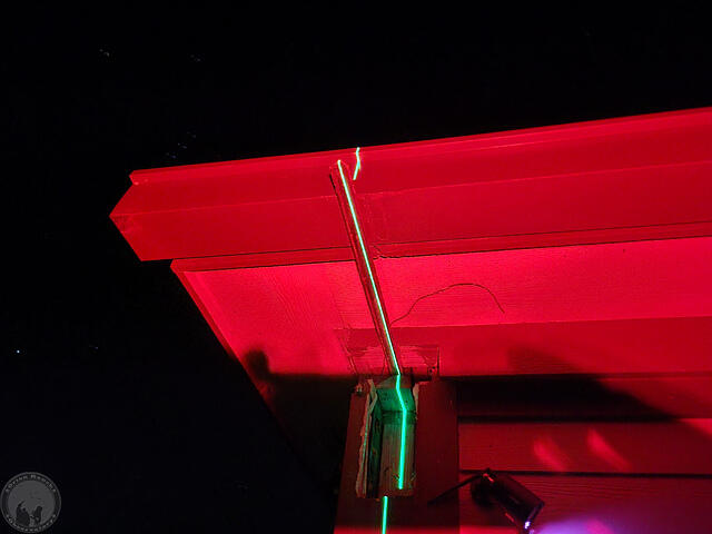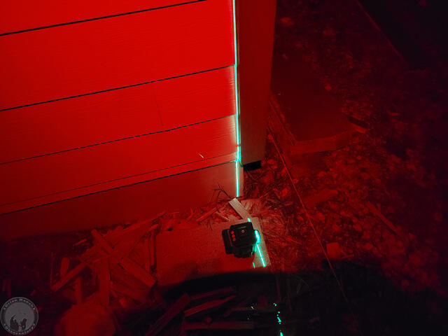 Aligning the self leveling laser on the marks from yesterday, they hit the V-groove angle iron rail pretty well, but if you look closely, there’s a bit of front-to-back variation on where it’s hitting. The other side was about the same.