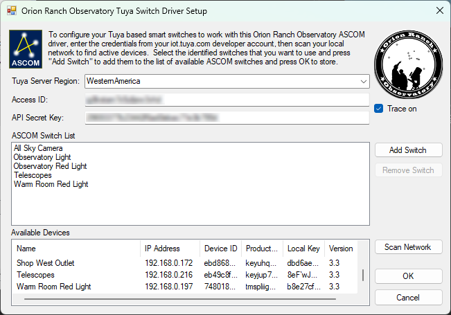 Orion Ranch Observatory Tuya Switch Driver for ASCOM Freeware License Agreement